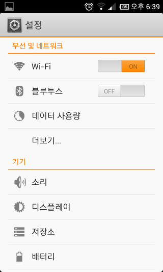 ICS의 기본 설정 레이아웃이 MIUI팀의 입맛에 맞았던 탓인지 순정 설정창을 색깔만 바꿔 사용합니다.