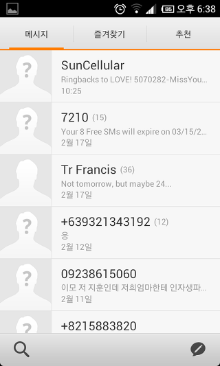 메시지앱도 자체 앱을 사용하고 있으며, 진저버전처럼 팝업 알림을 지원합니다.