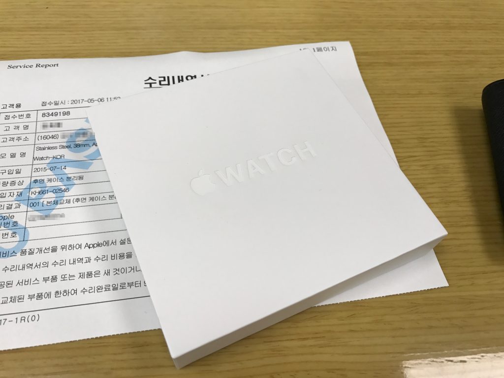 2년간 무상수리이므로 우선 최초 구입일을 아는 것이 중요했다. 박스에는 15년 5월에 생산된 것으로 되어 있었기에 아슬아슬하게라도 무상이 가능하겠지만 더 확실히 하고자 애플워치를 팔았던 형과 연락을 했고, 7월 중순에 산 것으로 확인이 되었다.