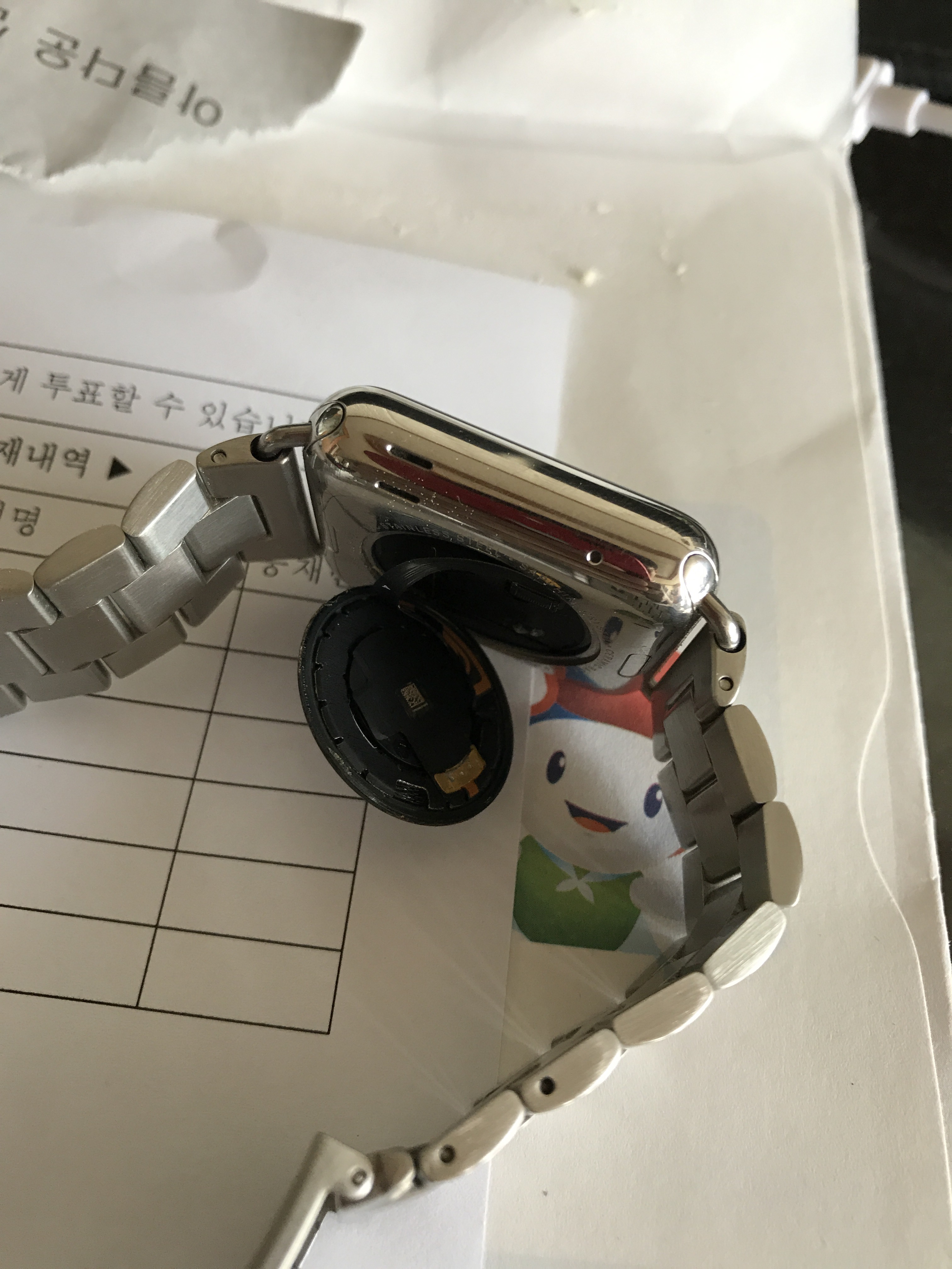 잘 알려진 사실로 애플워치 1세대는 충전 중 발열로 인해 접착제가 녹아 후면 심박센서 뚜껑이 분리되어 버리는 결함이 있다. (일명 뚜따-_-;;)
