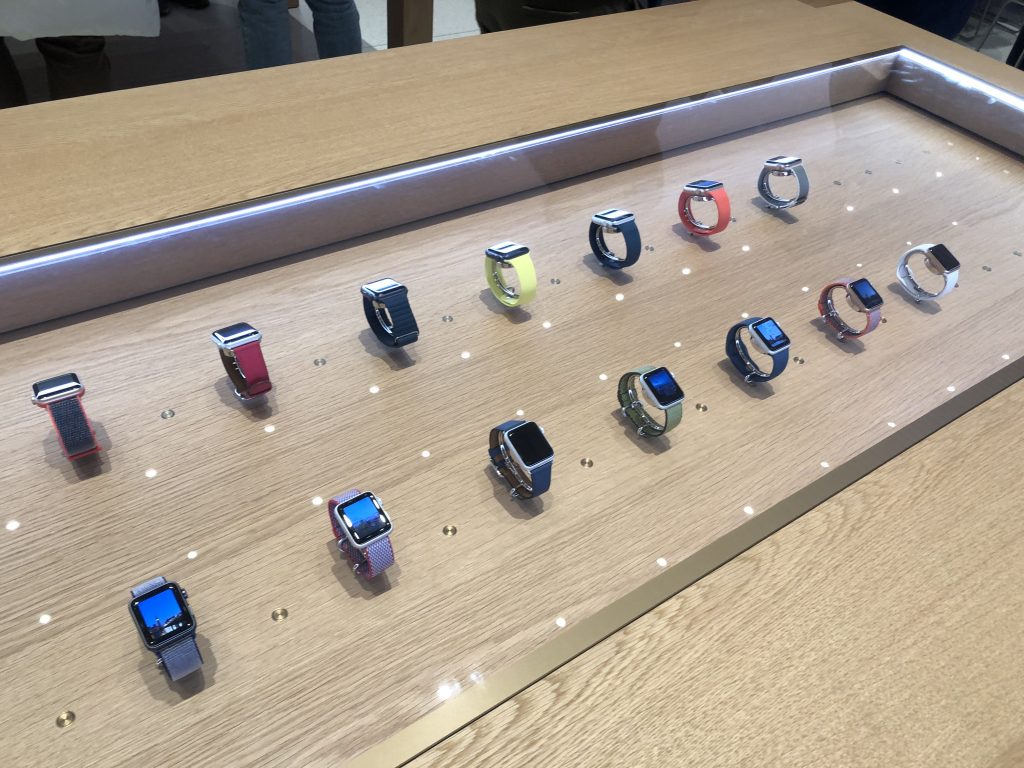 아이폰이 전시된 테이블을 지나면 애플워치가 색깔별 사이즈별로 전시되어 있다.
