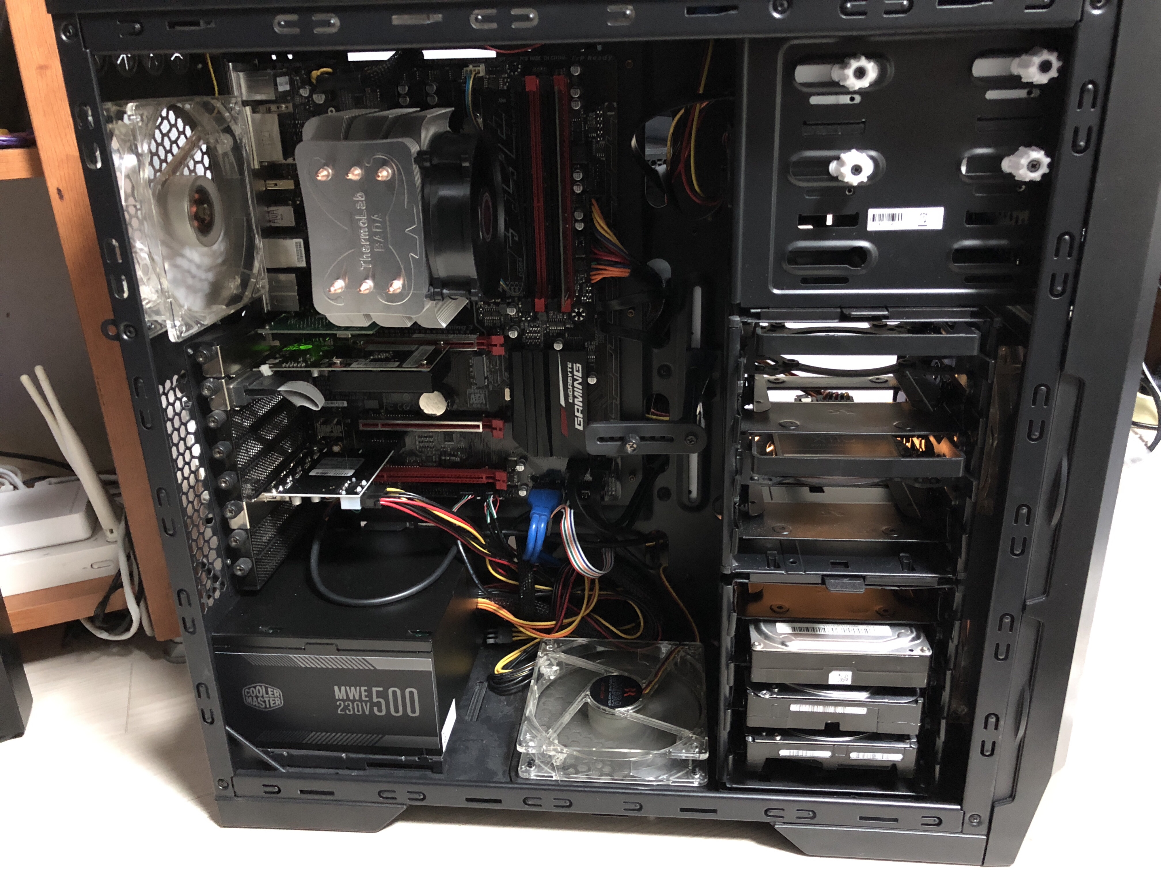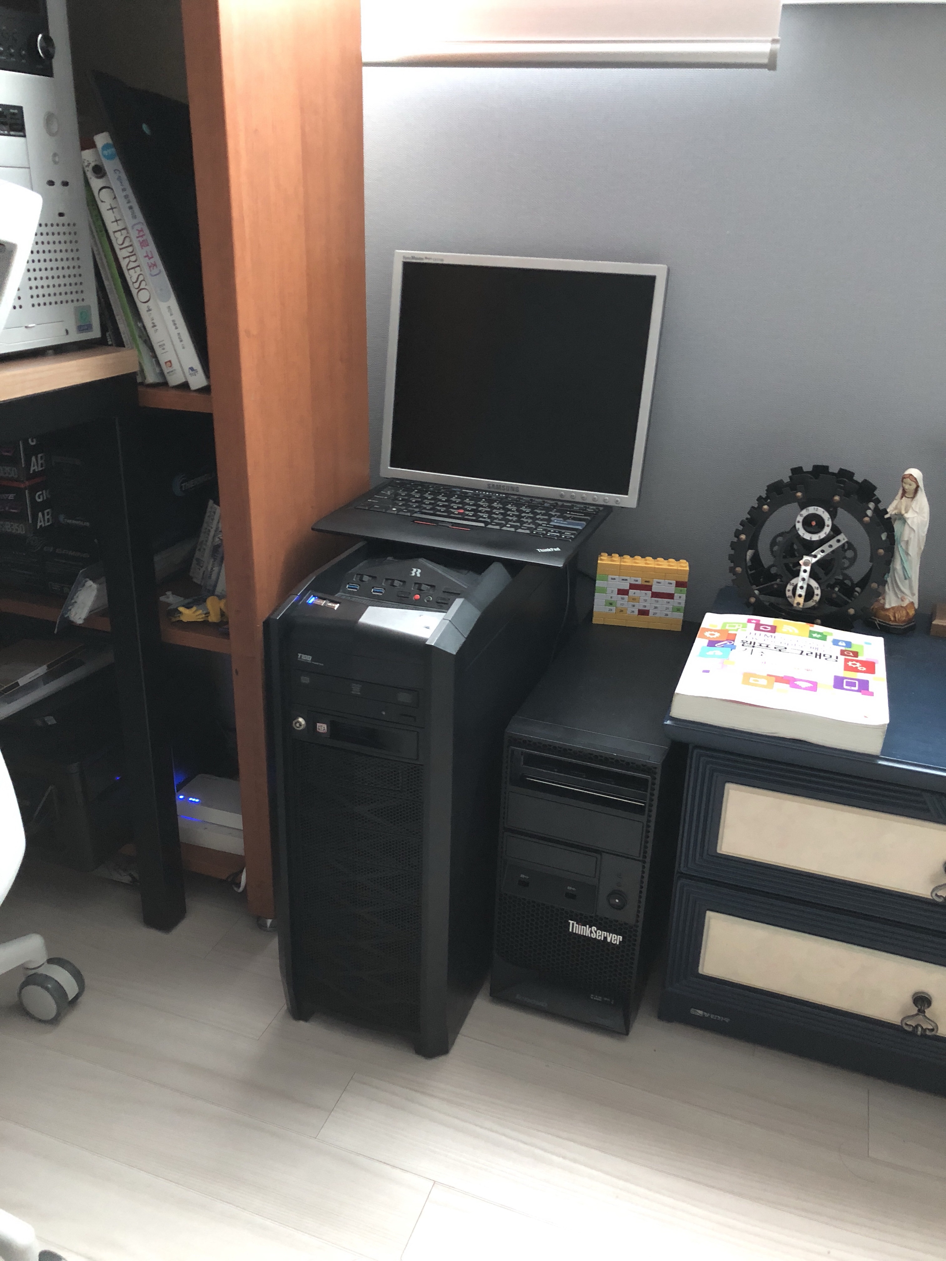 지난번에 구입했던 ITX 케이스의 확장성이 아쉬워 ATX급으로 옮기면서 하드도 한 개 더 추가하고, 메인보드도 ATX급으로 교체하고, 궁극적으론 이런 홈랩 컨셉에 맞추어 장식장 하나를 짜서 장비들을 욱여 넣는것이 목표이다.