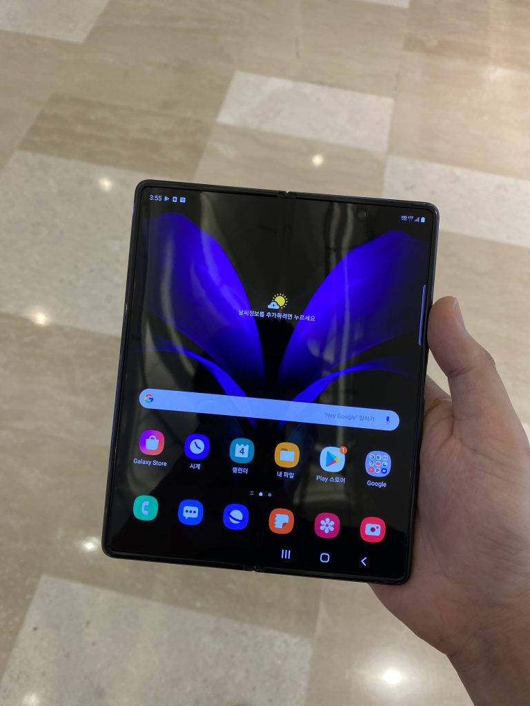 그러다가 100만원가량 할인된 폭탄 할인가에 폴드2를 얻게 되었다. 한 달 조금 안 쓴 중고였다. 폴드2는 폴드1에서 지적되었던 문제점들이 대부분 해결되었다. 노치가 없어지고, 화면은 전면 커버를 가득 채우고, 힌지는 고급스럽게 열리고 닫힌다. 폴드1 대비 절반으로 줄어든 내장메모리 용량이 아쉽지만. 한 달이 안 된 자급제 중고였기에 보험(삼성케어플러스)도 들 수 있었다.